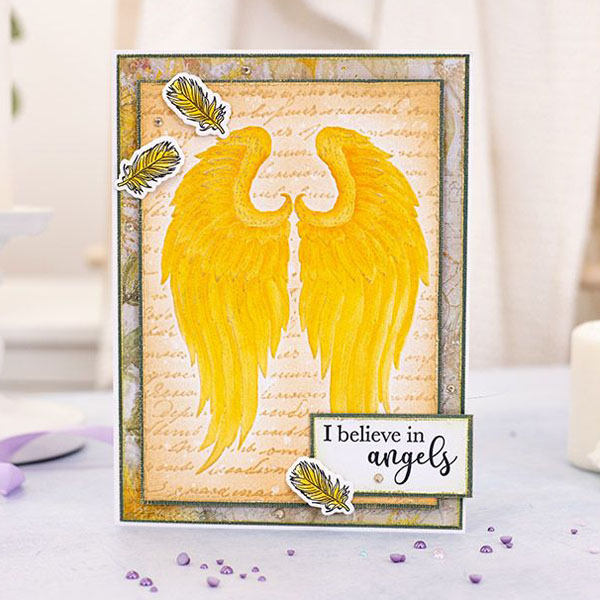 The 5"x7" Embossing Folder features angel wings with italic script handwriting in the background