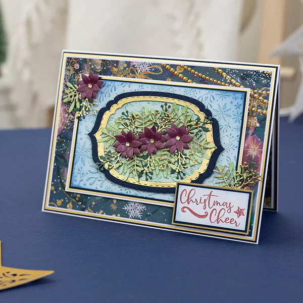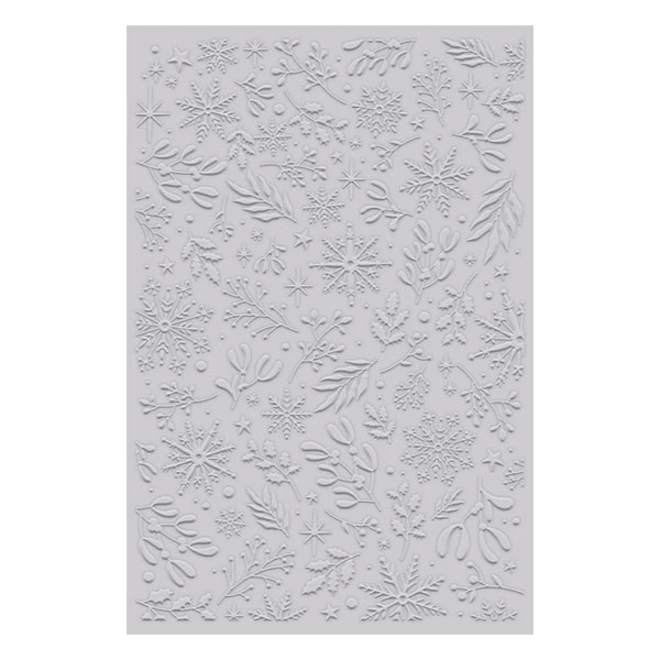 The 6"x4" Christmas Wishes 2D Embossing Folder creates a raised and embossed pattern of festive foliage, mistletoe, twinkling stars and delicate snowflakes.