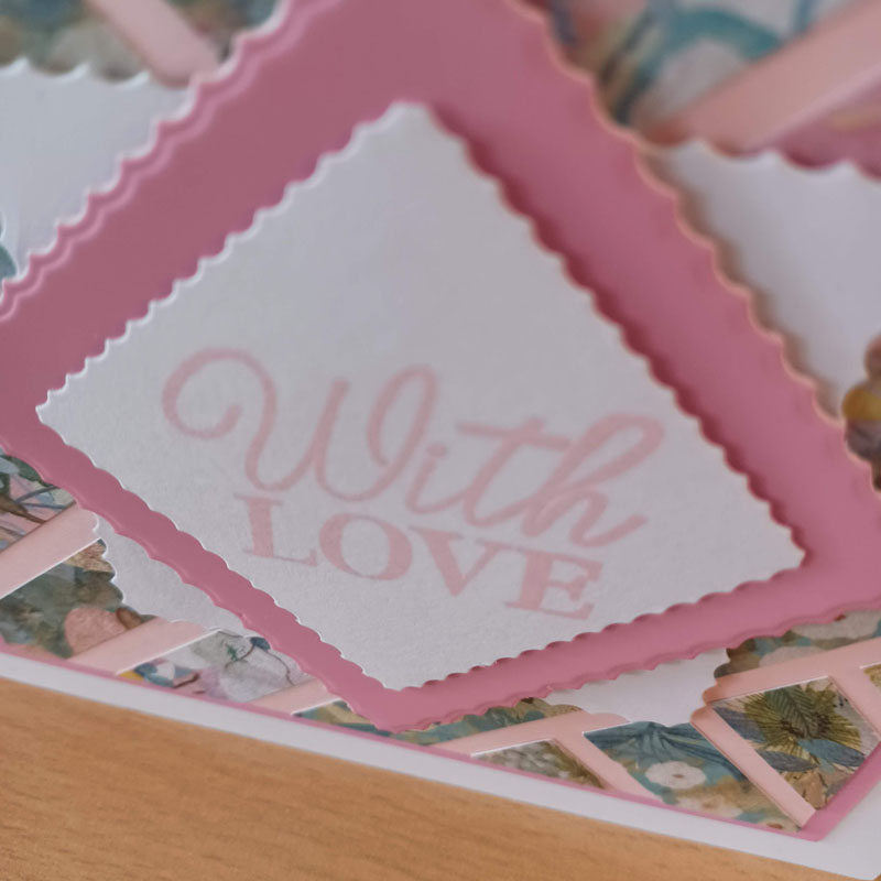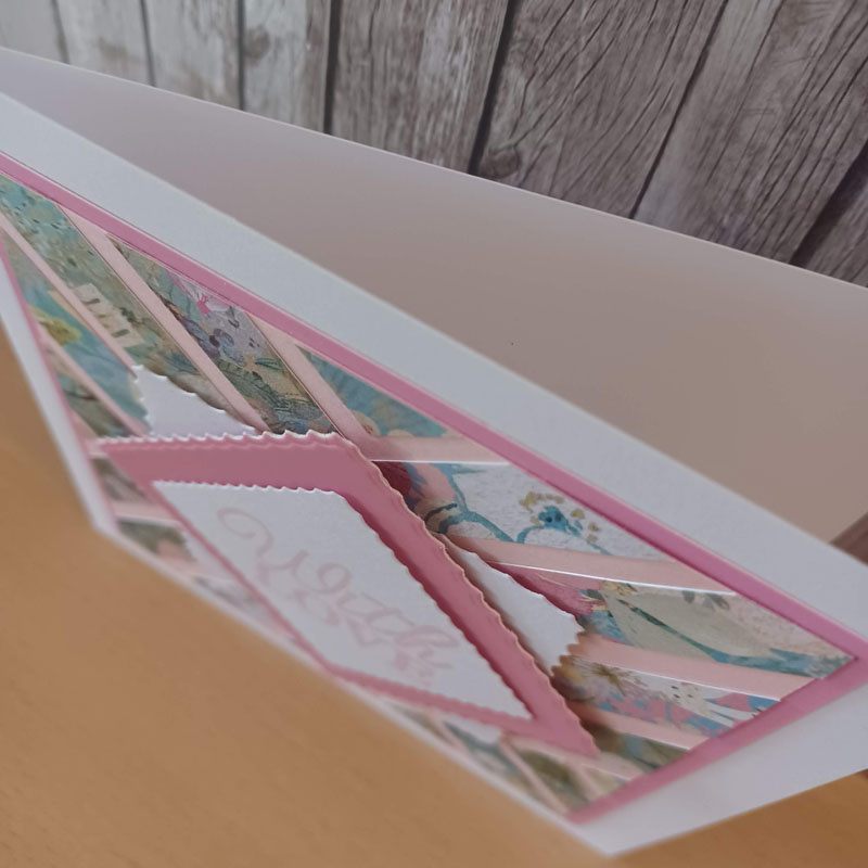 Details: white card blank with a decorated card topper containing multiple mats and layers, as well as a stamped sentiment centrepiece.