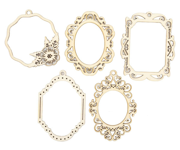 This set includes 20 laser-cut wood frames in five ornate designs (four of each design).