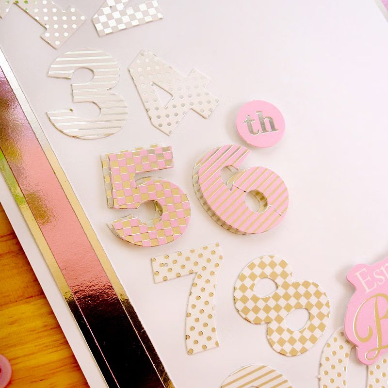 The numbers are foiled in various pretty patterns - universal enough to work with all kinds of themes.