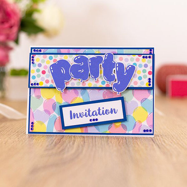In the Party Balloon Sentiments set, you will receive five stamps and dies to help you cut a PARTY sentiment made up of 2D balloons, plus extra words.