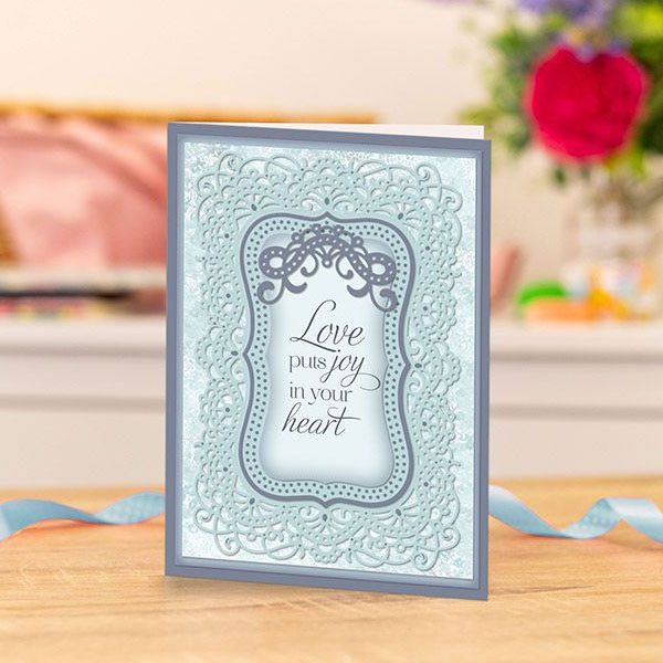 With the Delicate Lace Frame set you will receive four dies to create a rectangular frame with a traditional and intricate lace pattern, an ornate shaped inner frame and dainty tiara-shaped embellishment.