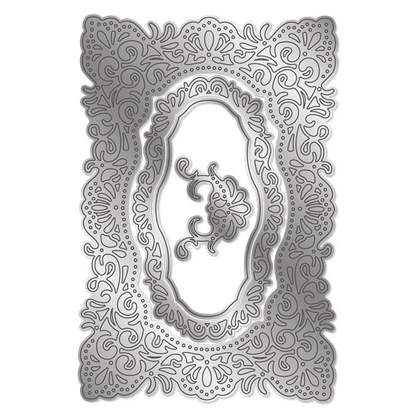 This set includes nesting dies to create decorative frames, with the most amazingly delicate designs! Layer up the different sizes to create a full and opulent look or use individually to create shaker cards, or to add a decorative topper or embellishment to your project!