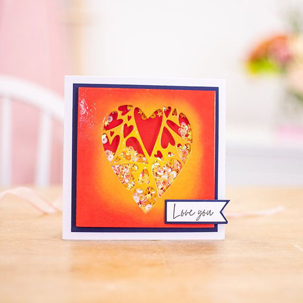 It is important to mention that this is a cut-in die. The single metal cutting die will cut into your piece of card, and leave aperture holes where all the little heart pieces have cut out, to make the large heart shape. You can even use all the cut out shapes as small die cut pieces to embellish your card with!