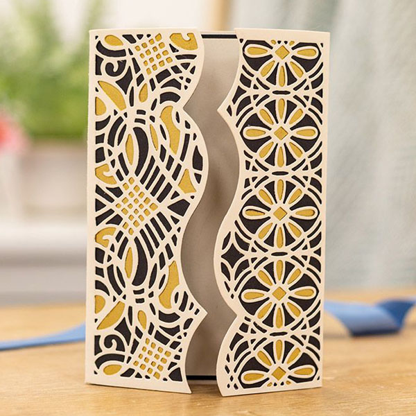 In the Floral Swirls set, you will receive 8 dies to create lace and floral-inspired gatefold card. The card opens out from two beautiful die-cut panels with an elegant swirled opening down the centre.