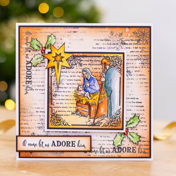 The Mary and Joseph set includes 9 stamps to create a beautifully layered nativity scene plus beautiful star embellishments. With an embellished frame, vintage-style text background and classic sentiments such as "O Little Town of Bethlehem" and "O Come Let Us Adore Him".