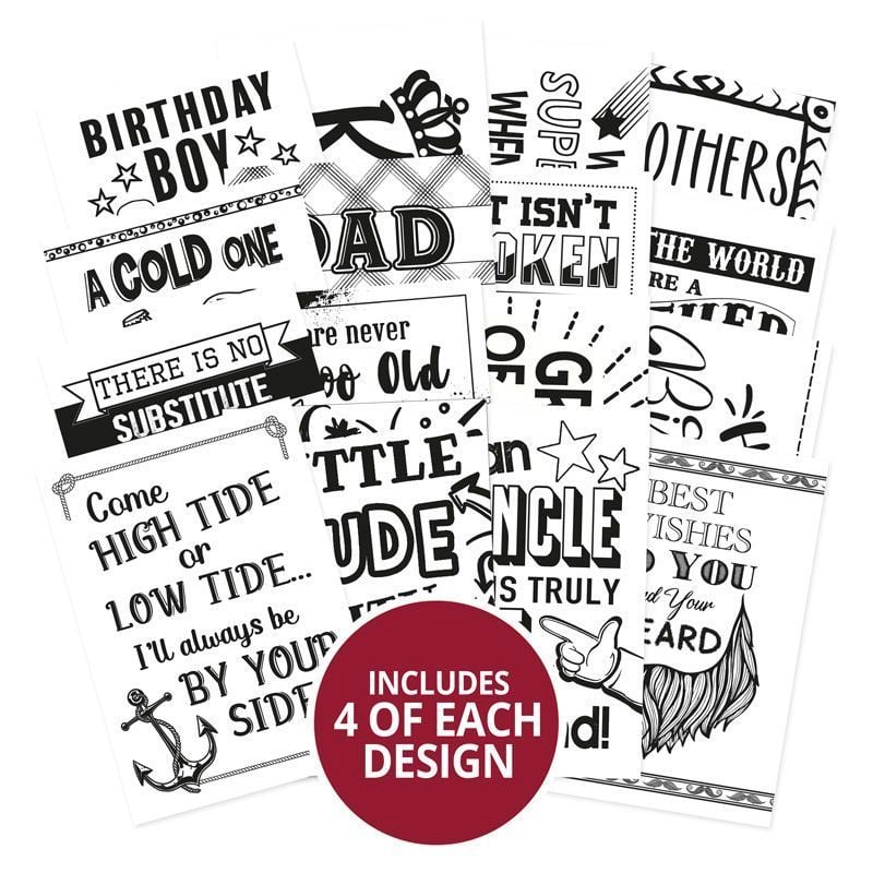 These pads include 64 x Ink Me! pages. There's 16 different fabulous typographical centrepieces presented in black, and there's 4 of each. With a selection of different sentiments, statements and puns throughout, there really is something for everyone.
