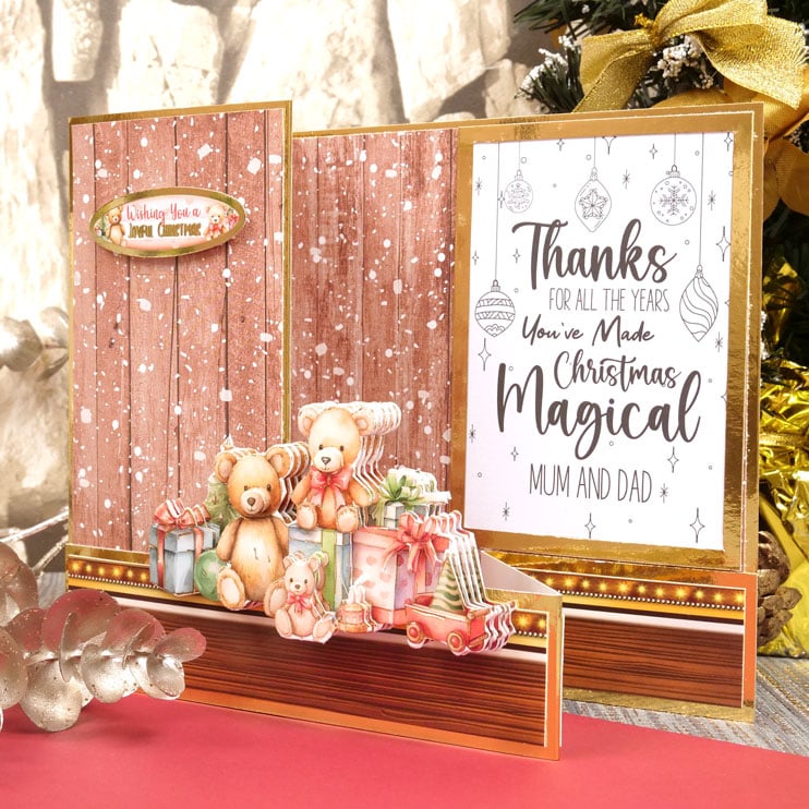 A sheet of die cut decoupage card toppers containing icons and sentiments, with stunning gold foil highlights.