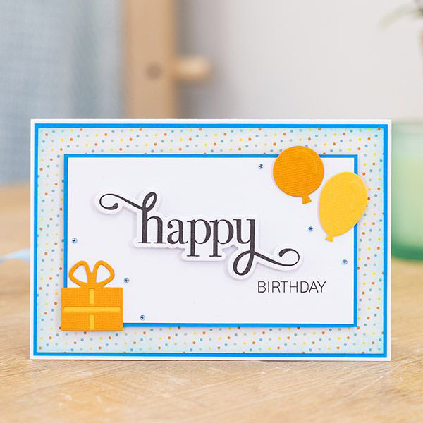 In the "Happy Birthday" set you receive one die and two stamps. Use the large stamp and the corresponding outline die to create a large "happy" message in a timeless and elegant font. An additional stamp with a smaller "birthday" message can be placed alongside to create a special celebration card. Use together for birthday cards, bags and gifts, or individually to customise your own creation, the creative possibilities are endless!