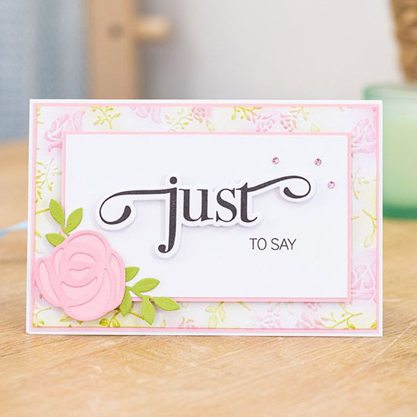 In the "Just To Say" set you receive one die and two stamps. Use the large stamp and the corresponding outline die to create a large "just" message in a timeless and elegant font. An additional stamp with a smaller "to say" message can be placed alongside to create a special celebration card. Use together for cards, bags and gifts, or individually to customise your own creation, the creative possibilities are endless!