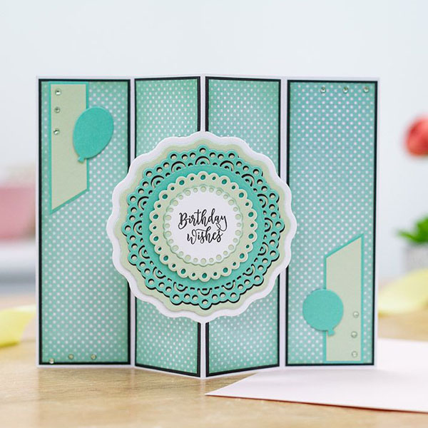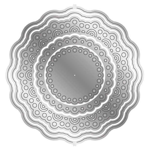 The Grande Circle set includes five dies to create a circular pop-out panel with layers of lacy die-cut decoration and scalloped circles.