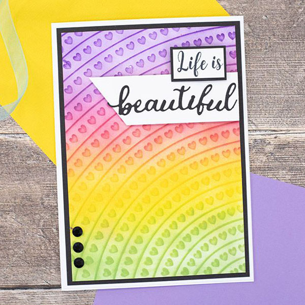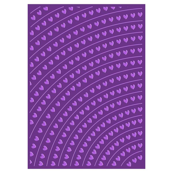 The 5"x7" Rainbow Hearts 2D Embossing Folder creates a raised embossed rainbow design, with each stripe filled with sweet little hearts.