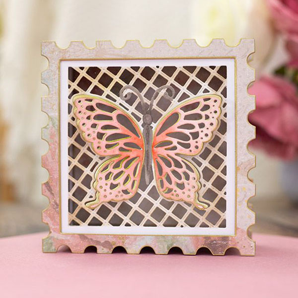 This set includes three dies. You will receive an outer postage stamp style frame, an inner square frame, and then an inner die which has a lattice background with a butterfly inside with liftable wings.