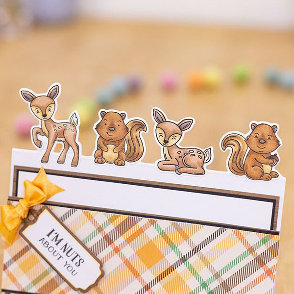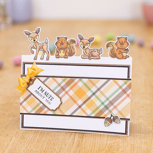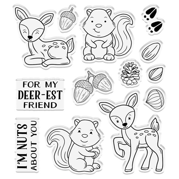 The "Nuts About You" set features 13 stamps and 4 dies to create two deer and two squirrel designs to place onto the top of your cards, bookmarks, party, invitations, tags and much more. Cute paw prints, nut decorations and quirky themed sentiment stamps offer the perfect finishing touch for your card or craft.