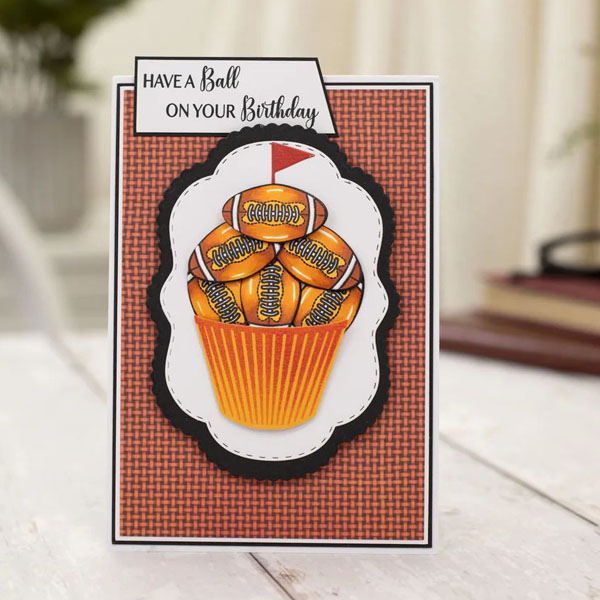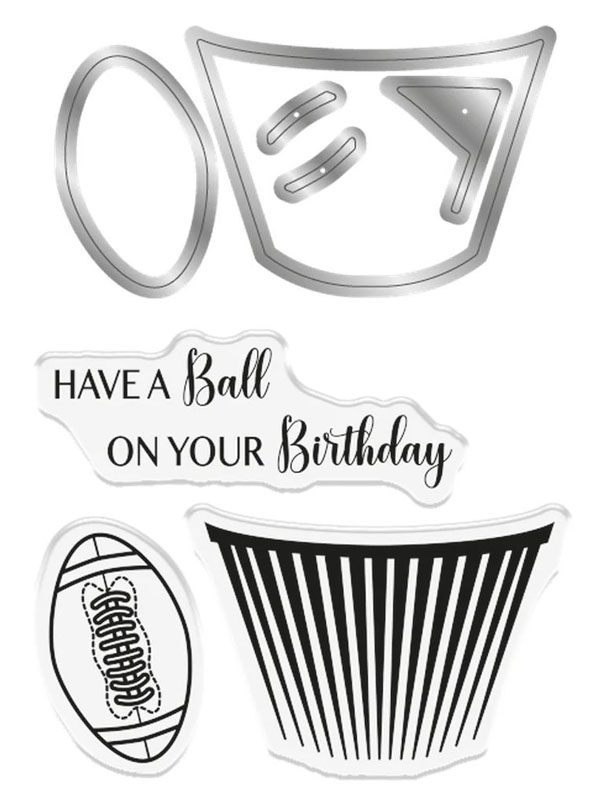 This set includes five metal dies and three stamps. Create a cupcake filled with balls, and a sentiment stamp "Have a ball on your birthday" to coordinate with it. The perfect celebration card centrepiece for football fans!