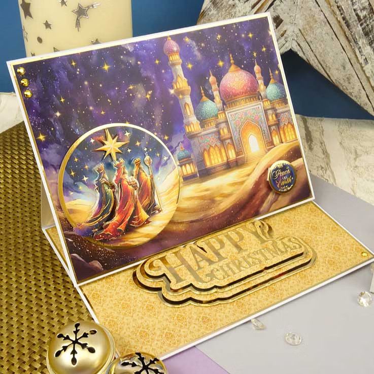 A sheet of die cut decoupage card toppers containing icons and sentiments, with stunning gold foil highlights.