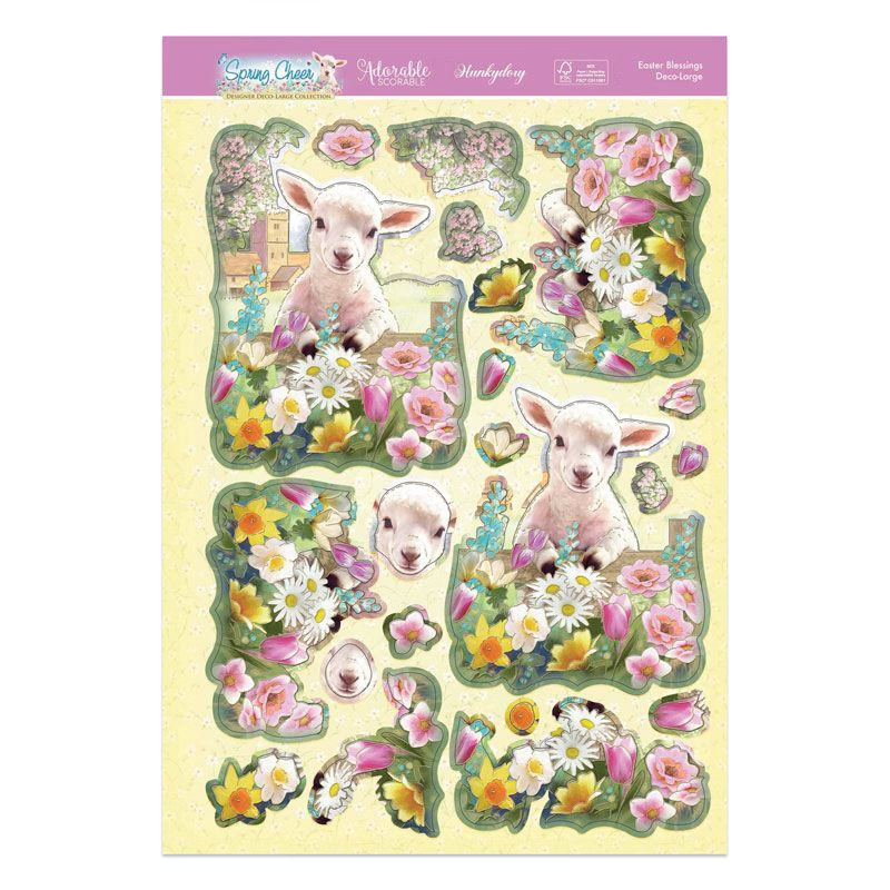 Taken from the "Spring Cheer" collection, this is a deco-large (large decoupage) set. The A5 base layer sheet contains the base layer of the decoupage item, as well as extra elements (such as sentiments, and border strips). The A4 decoupage sheet has all the layers to build up onto your base layer. The sheet of printed cardstock coordinates beautifully with the rest of the set.