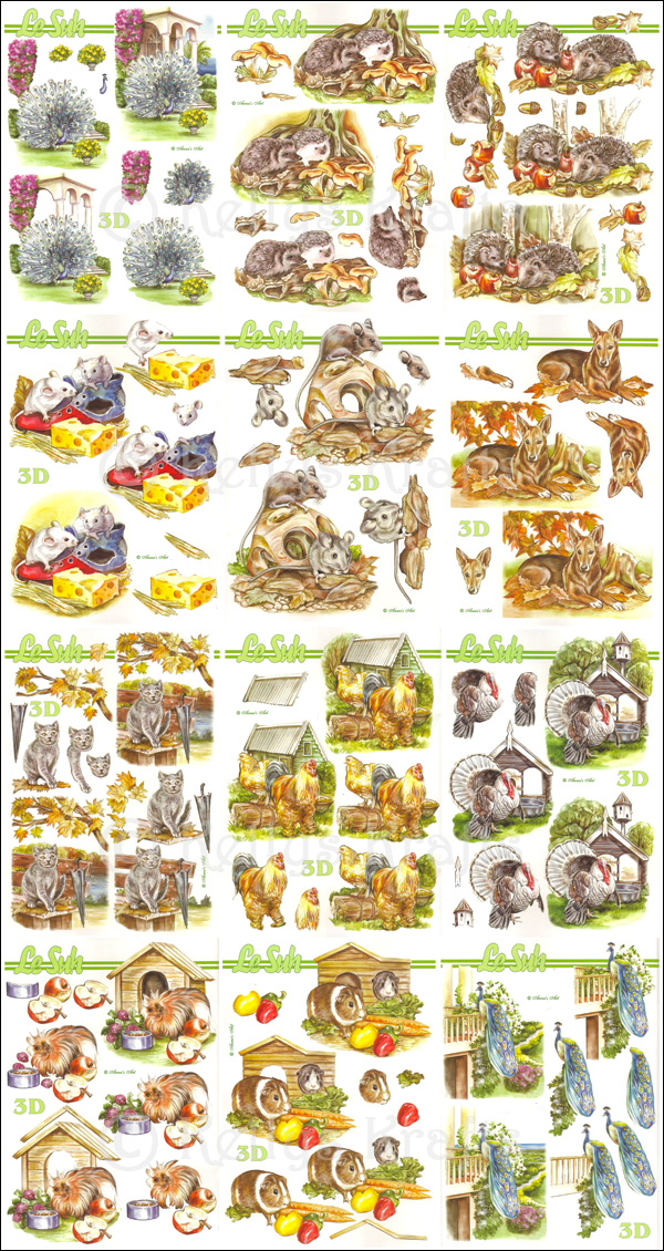 Theme: animals/pets, mice, guinea pigs, cat, hedgehogs, peacock, etc