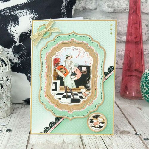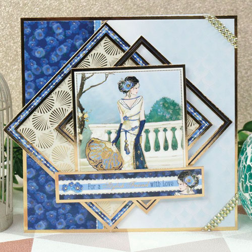 Art Deco Days - features friends enjoying cocktails, a stylish trip and a fabulous ornate floral garden. With sentiments: cheers to you on your special day, just for you, with love, best wishes.
