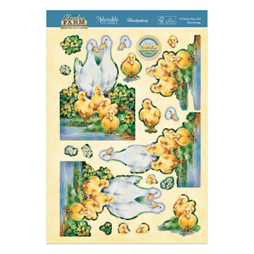 Taken from the "Meadow Farm" collection, this is a deco-large (large decoupage) set. The base layer of the decoupage item is a staggering 15.2cm x 10.1cm. The rest of the A5 base-layer sheet is filled with extra elements (such as sentiments, captions, and border strips). The A4 decoupage sheet has all the layers to build up onto your base layer. The sheet of printed cardstock coordinates beautifully with the rest of the set.