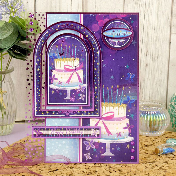 The sheet of card toppers contains icons, captions and sentiments, with stunning purple highlights.
