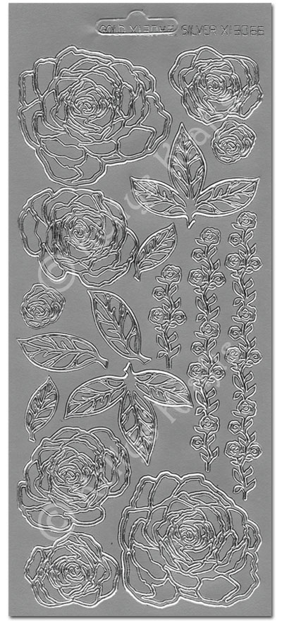 Rose Flower Heads & Leaves, Silver Peel Off Stickers (1 sheet)