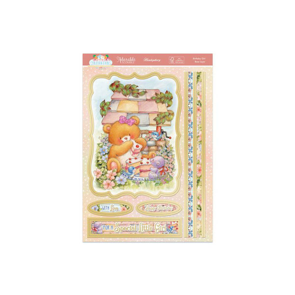 Taken from the "Cutest Celebrations" collection, this is a deco-large (large decoupage) set. The base layer of the decoupage item is a staggering 13.7cm x 10.1cm. The rest of the A5 base-layer sheet is filled with extra elements (such as sentiments, and border strips). The A4 decoupage sheet has all the layers to build up onto your base layer. The sheet of printed cardstock coordinates beautifully with the rest of the set.
